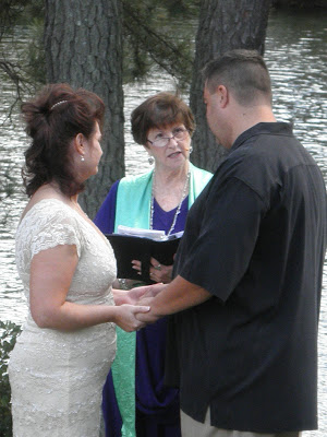 When they got down front, they turned and faced their guests and I said: "There is an old tradition that the elders, or the wise ones of the tribe or family give the beloveds to one another as an acknowledgement of their support for this union. I believe all of you here qualify as the tribe of Ric and Sam. So, please all answer “We do” when I ask, “Who has the privilege of presenting this woman, Sam, to this man, Ric?” Of course they all shouted "We do!"