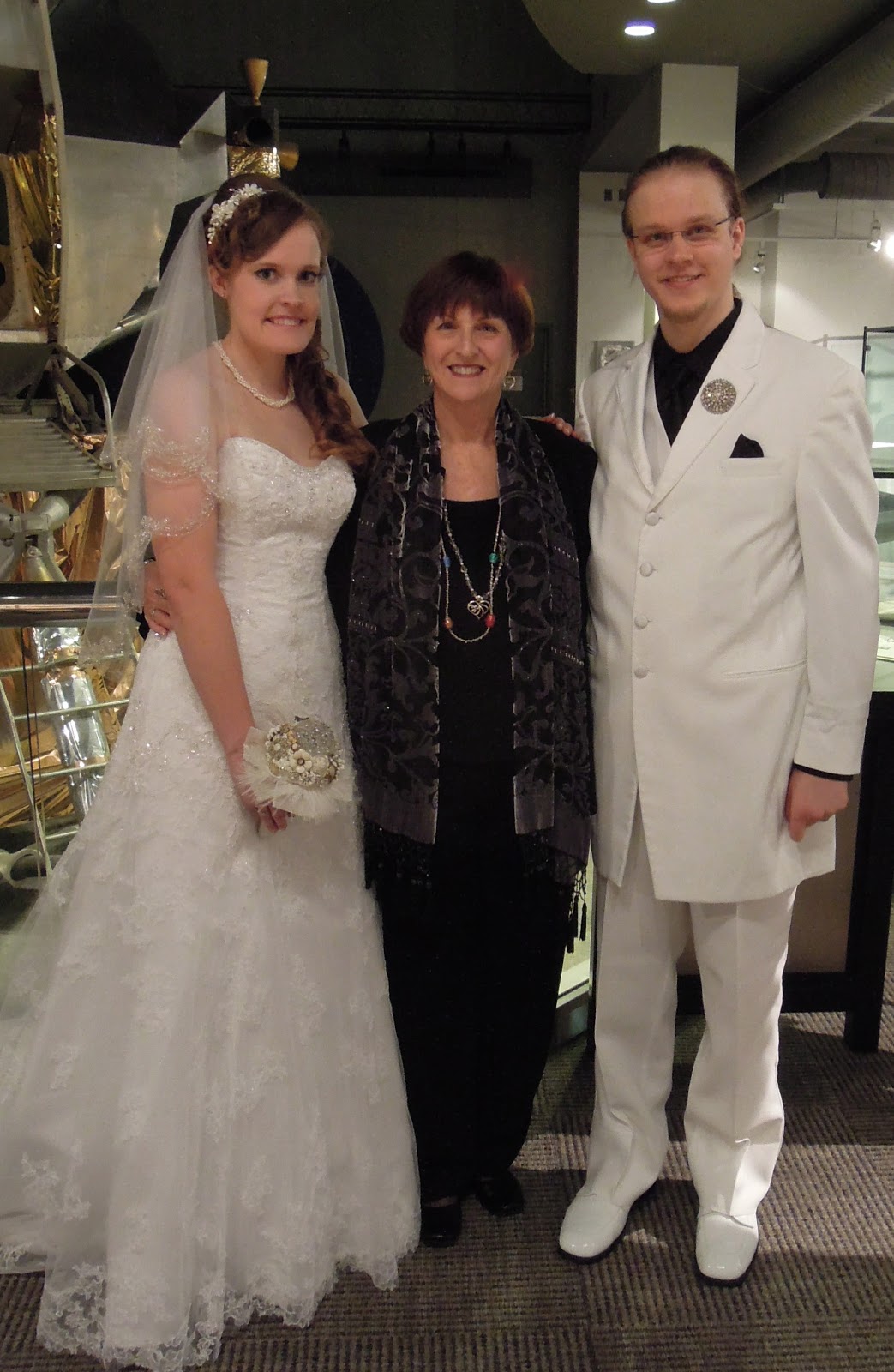 I invited the guests to partake of cocktails while the wedding party departed to the lunar landing exhibit. I got Dave to take a closer photo of the bride's beautiful brooch bouquet. She told me she got it on eBay!