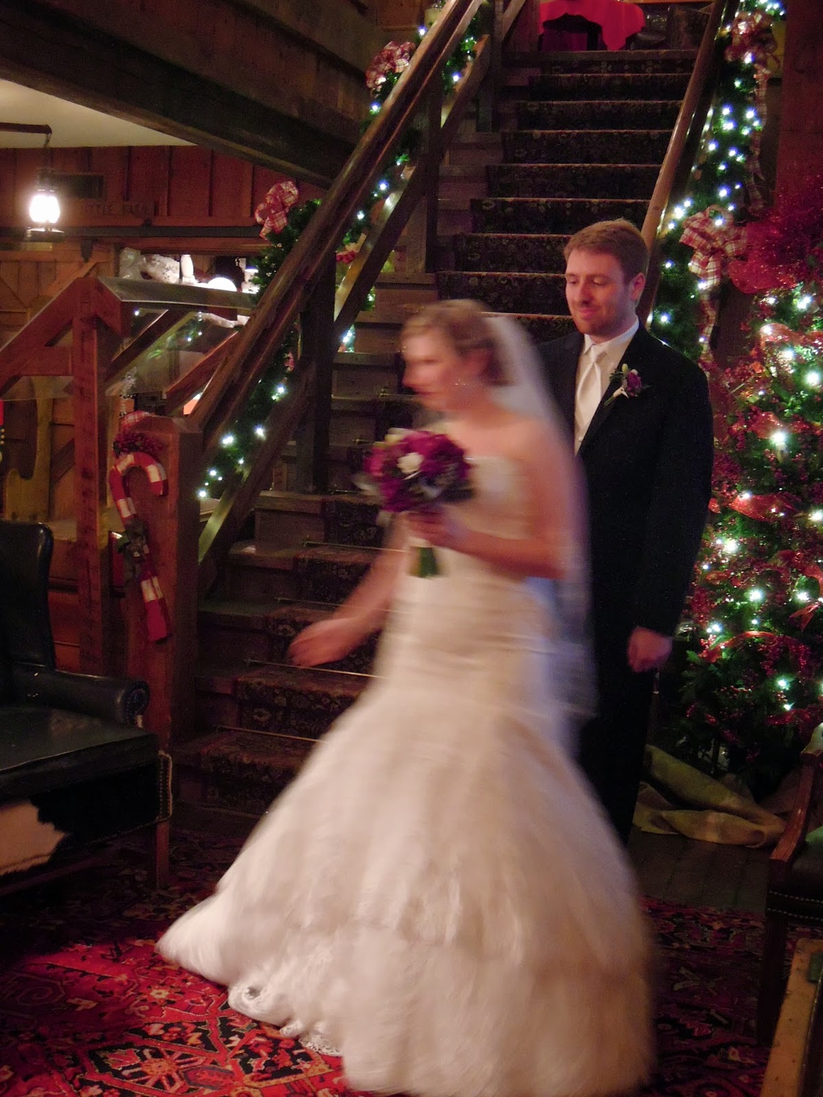 Megan, Jarrett and I met on July 4th of this year to plan their wedding ceremony slated for December 14, 2013 at the wonderful Angus Barn which would be in full Christmas decor. Their ceremony was in front of the big fireplace in the lobby of the restaurant which was closed to the public until after their wedding. The reception was down in the fabulous Wine Cellar where I have also done several weddings. Marty and I arrived early and made sure all was ready. There were only about 20 guests so it was a small intimate group.