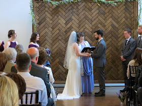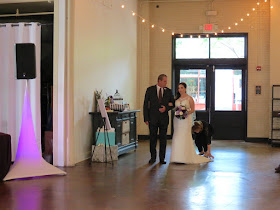 First thing I did was check in with our DJ, Darnell Davis with ME Wedding DJ company. He plugged my mic into his system and we did a sound check. Thanks, Darnell!The tables were gathered together on one side of the big open room while the chairs were in the other side for the ceremony. After the ceremony, the guests go to the back of there area to the bar for cocktails while the staff reconfigures the room for the reception. Rocky Top was catering. Yummy! Urban Bloom Photography was their professional photographer. (Photos in this blog taken by my hubby/roadie Dave with my Canon Powershot and iPhone.)